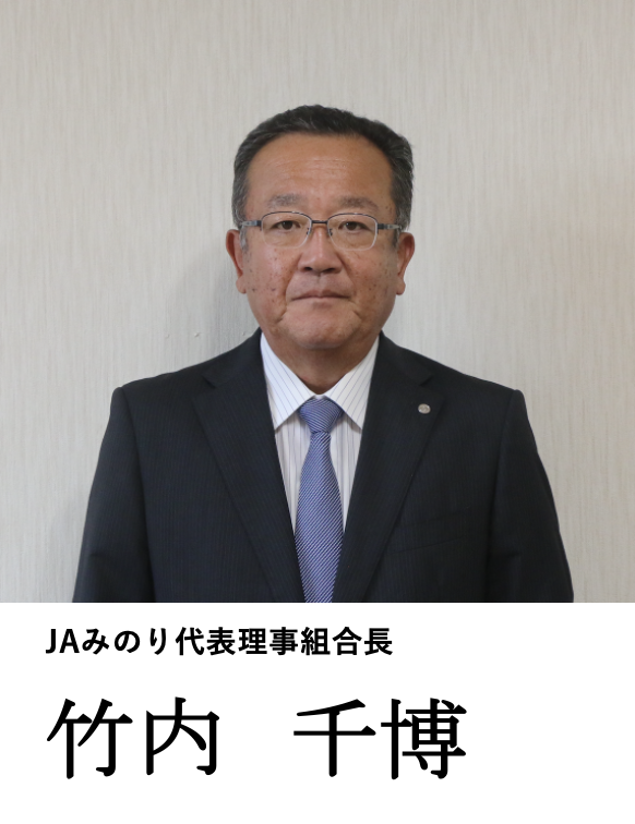 そして、令和7年度は、「協同活動と総合事業で食と農を支え、豊かな暮らしと活力ある地域社会の実現」をテーマとした第9次3カ年中期経営計画、第8次営農振興計画の初年度として、新たな一歩を踏み出す年です。役職員が一丸となって、一人でも多くの方に「JAに相談すると安心」、「JAがあって良かった」と言っていただけるように、「地域に根ざすJA」としての使命を果たしてまいります。 組合員・利用者の皆さまには、引き続き「JAみのり」にご支援とご協力を賜りますようお願い申し上げ、就任のあいさつとさせていただきます。